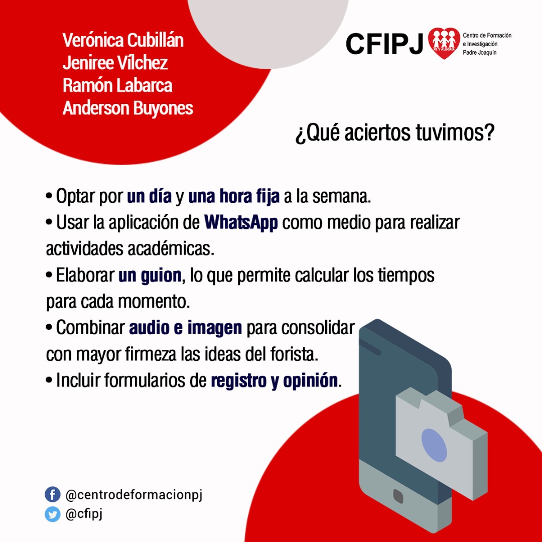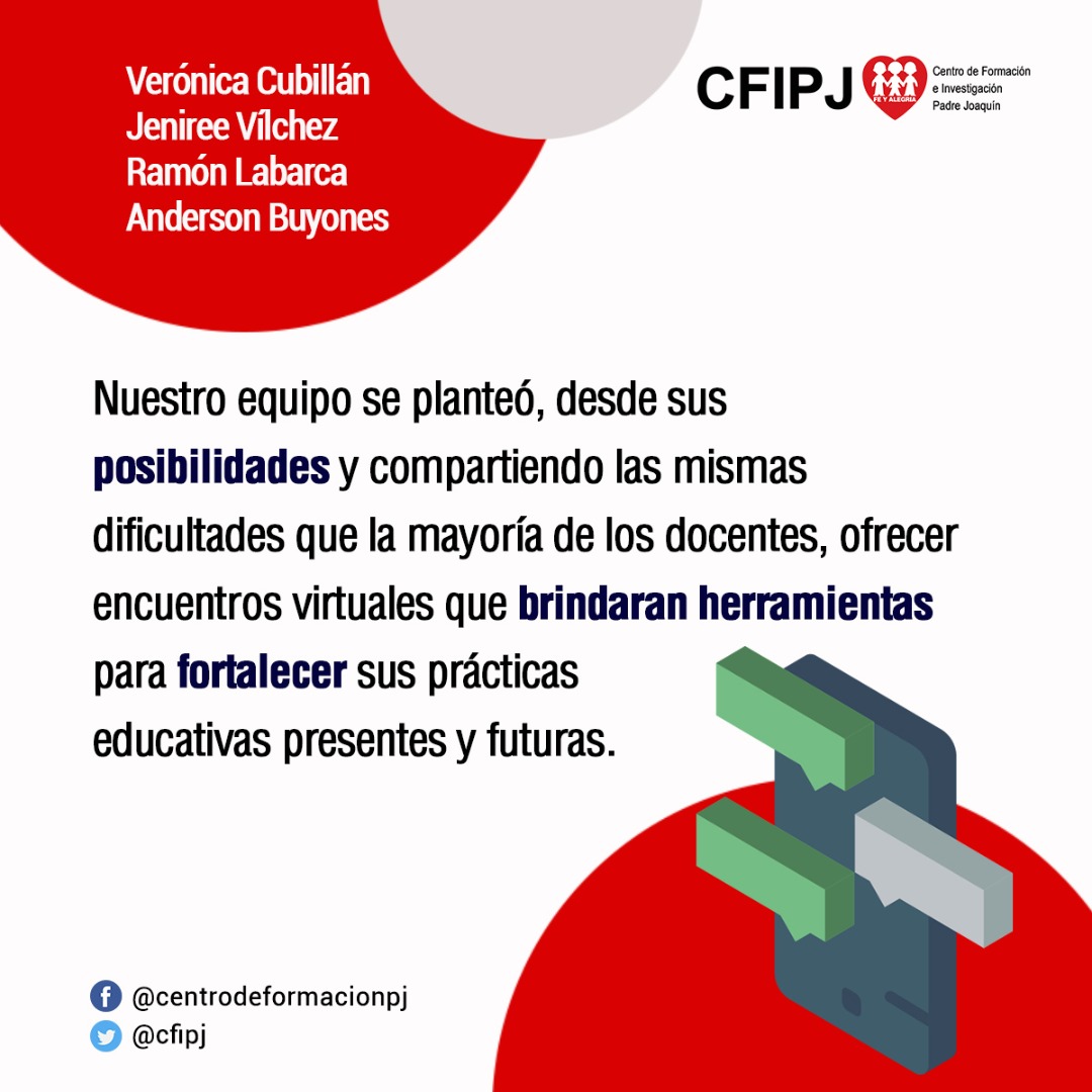 Por esa y otras razones el Centro de Formación e Investigación Padre Joaquín ha ofrecido encuentros virtuales para brindar herramientas que favorezcan las reflexiones de las prácticas educativas presentes y futuras en los docentes, a través de la aplicación de WhatsApp.