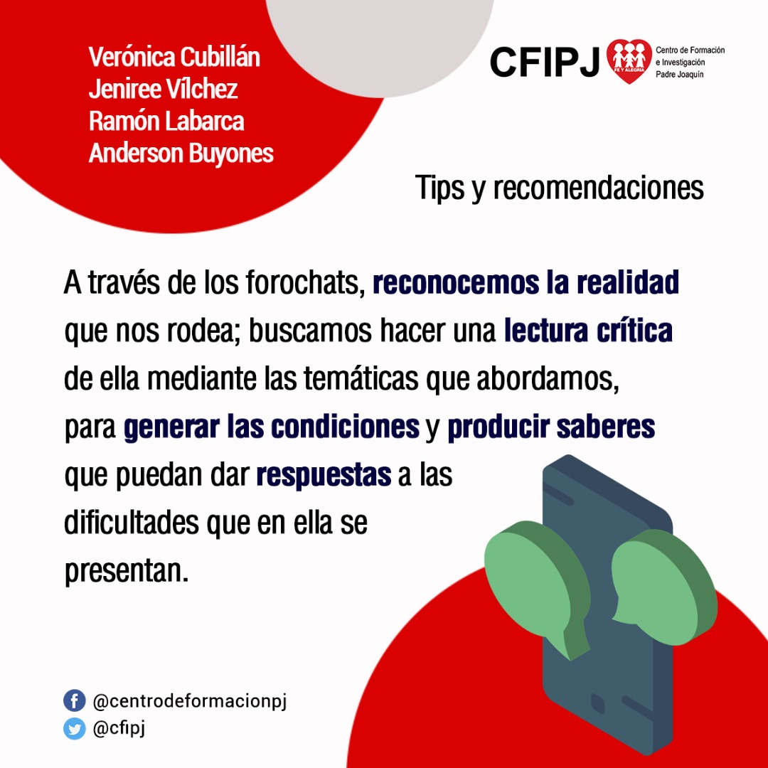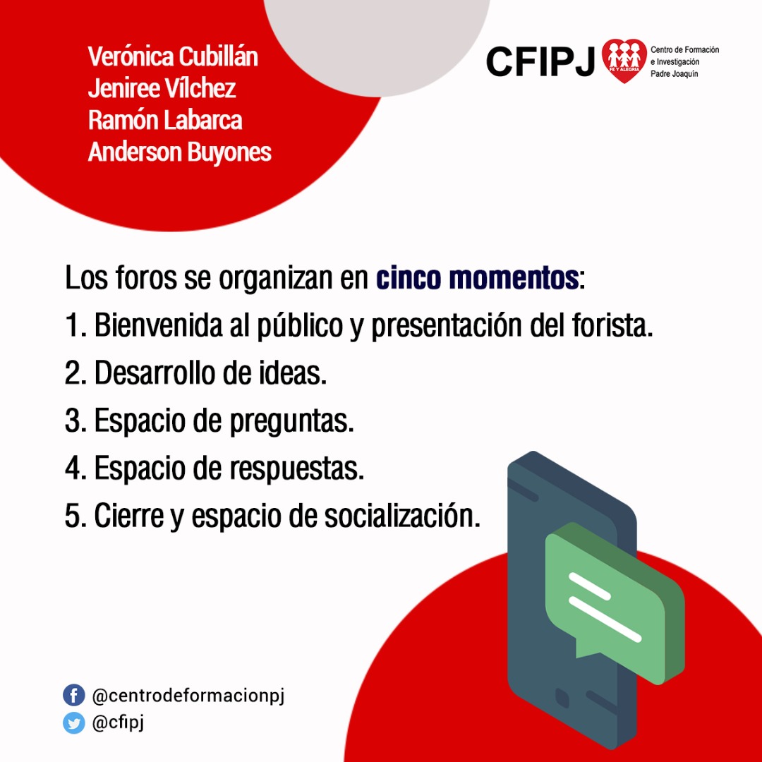 - Cierre: Más que el cierre de la actividad, este espacio es para culminar la interacción con el forista. Sin embargo, el chat queda abierto el resto de la jornada para la socialización e intercambio de ideas entre los participantes, sobre todo de aquellos que no tuvieron la oportunidad de estar presentes durante la exposición del tema.